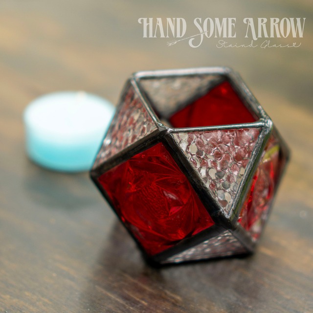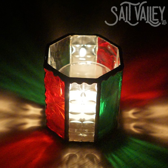 クリスマスカラーのガラスを使った、ちょっと背の高い八角形のキャンドルホルダー。 バラのモールドの赤いガラス、切り子のようなモールドのクリアガラス、鮮やかな緑のガラスを合わせ、クリスマス気分満載にしました。 透明色ガラスを使うことによってキャンドルの炎が周りに光と影・色を、高さがあるのでので、広範囲に広がり届けます。 キャンドルホルダーとしてはもちろんのこと、小物入れやペンスタンド、メイク道具立てにも使っていただけます。 漏れる可能性がありますので、水を入れたままにはしないようお願いします。 サイズ・幅: mm 奥行き: mm 高さ: mm ※手作りのため、サイズはおおよその目安です。 仕様・クリアモールドガラス、クリアローズモールドガラス、グリーンガラス、ハンダ部分アンティークゴールド仕上げ 素材・各種ガラス 銅テープ ハンダ