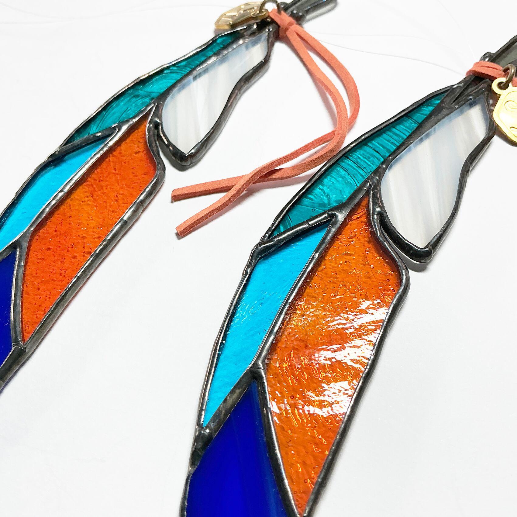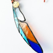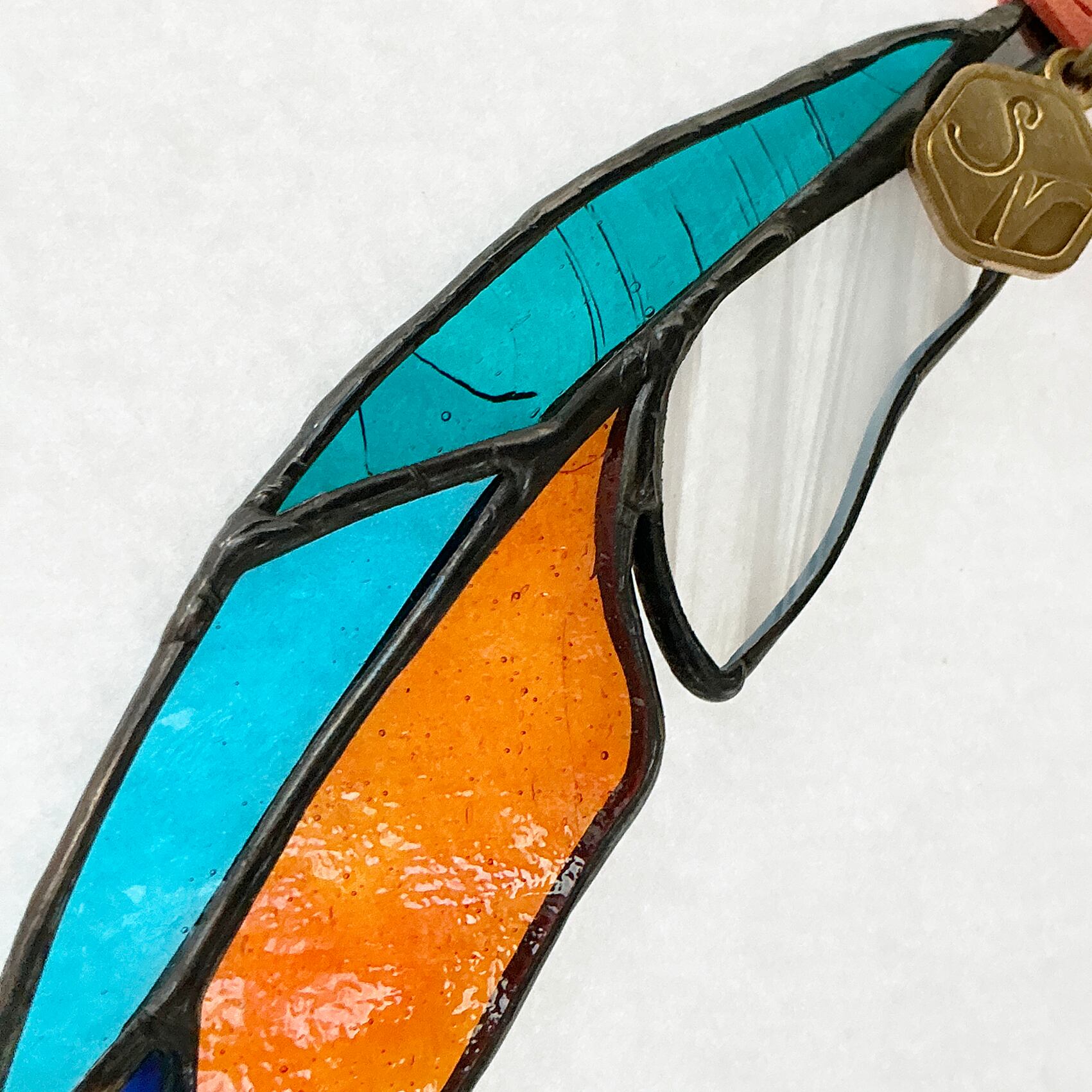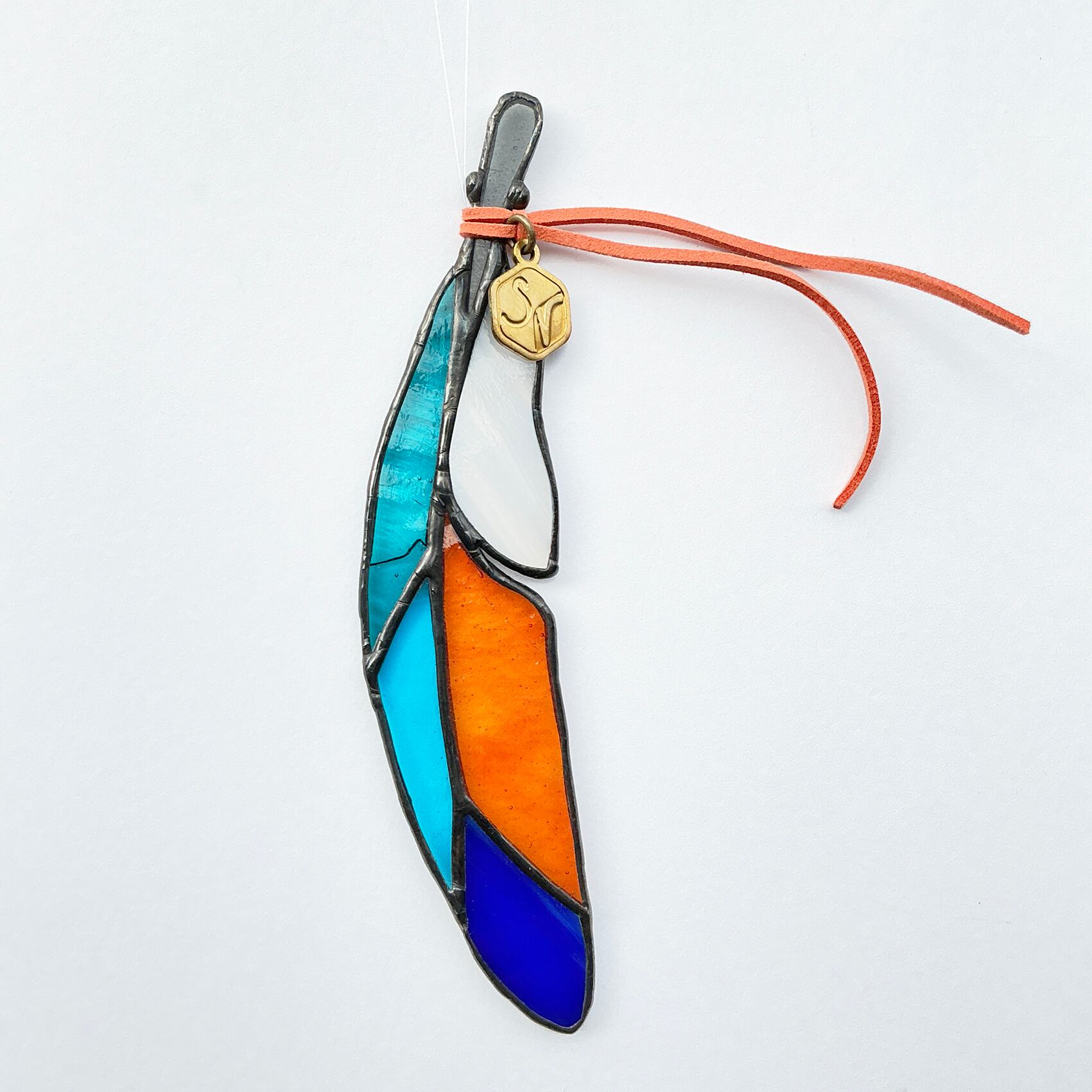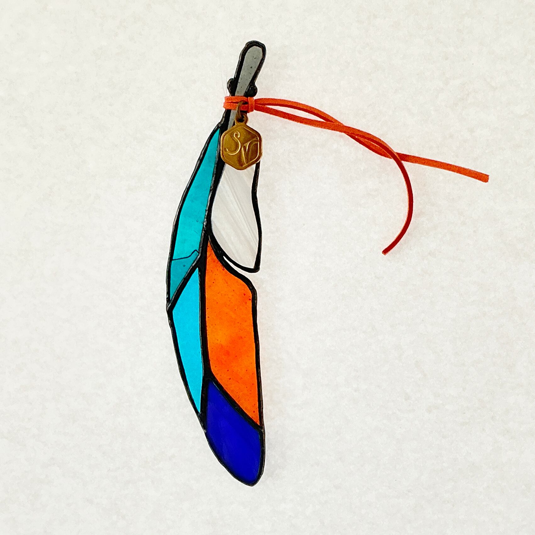 このサンキャッチャーは、自然の美しさをそのまま切り取ったかのような魅力を持つ作品です。鳥の羽根をモチーフに、小鳥を象徴的に表現したデザインは、エメラルドグリーンとブルー、そしてオレンジ色のガラスが絶妙なコントラストを描き出しています。これらの色ガラスとモールドガラスが、まるでカワセミが窓辺に舞い降りたかのような鮮やかな光の演出を生み出します。