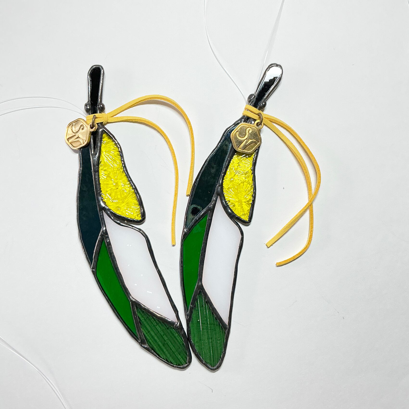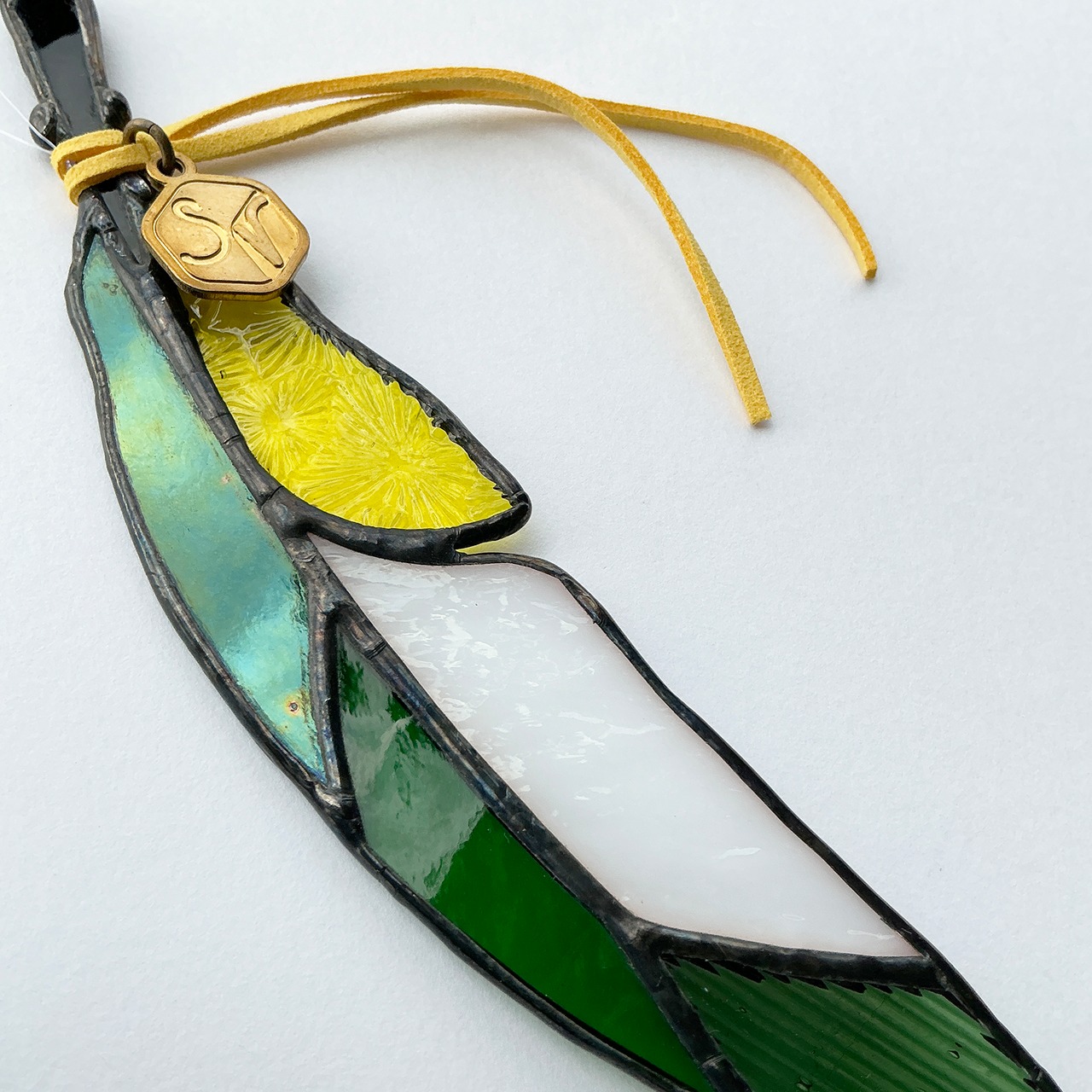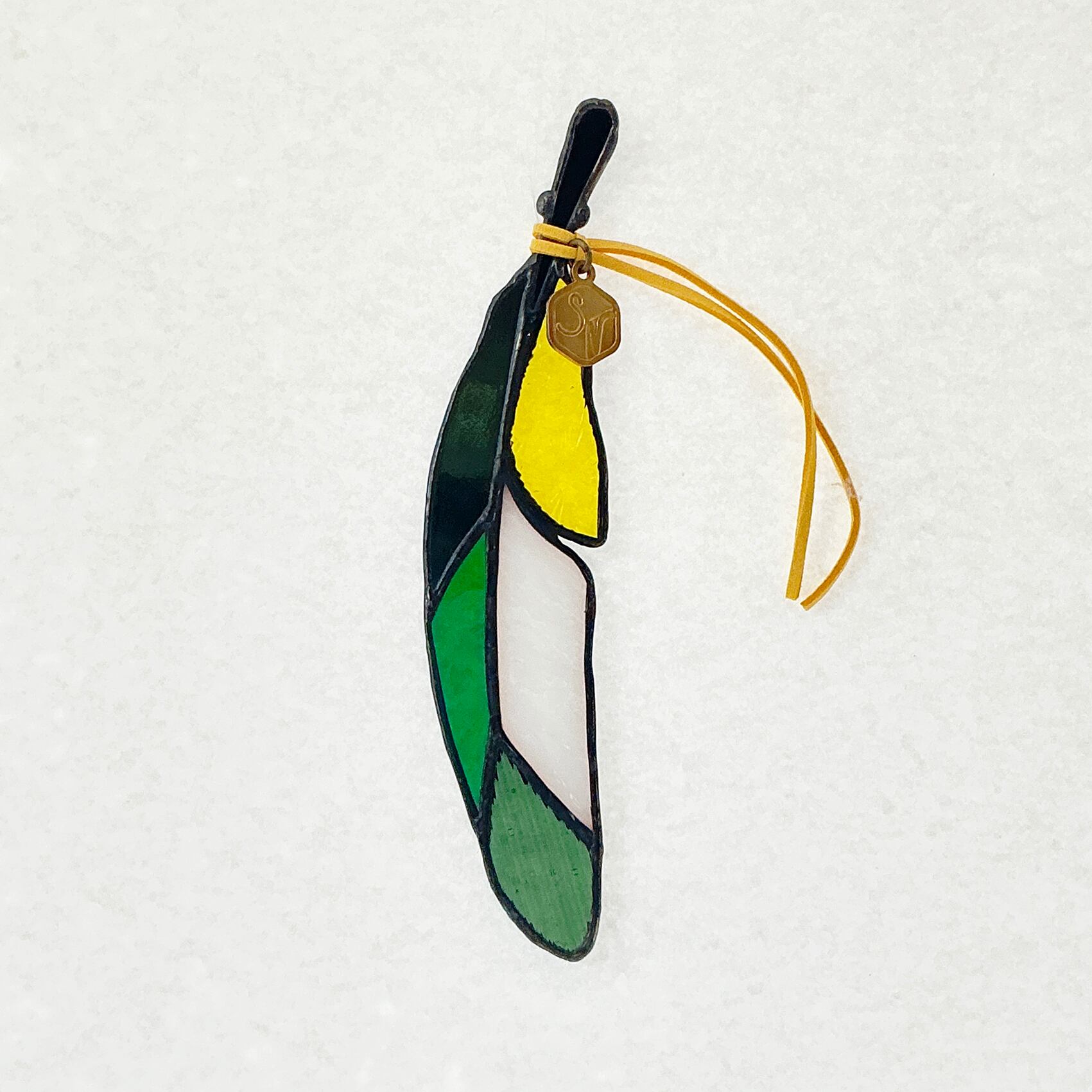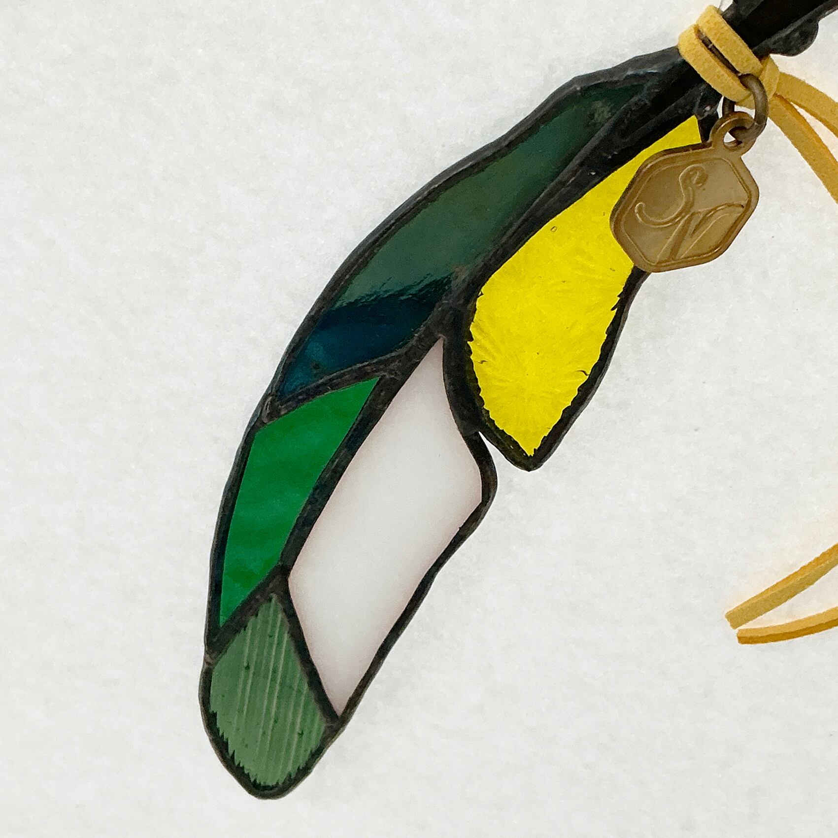 窓辺に吊るされた瞬間、あなたの部屋に魔法のような光と癒しを運ぶサンキャッチャー。深いグリーンの色ガラスで丁寧に作られたこの作品は、ズグロシロハラインコの可愛らしい姿を鮮やかに表現しています。まるで本物の鳥の羽根のように、風を受けてゆらゆらと揺れる様子は、見ているだけで心がほっこりと温かくなります。