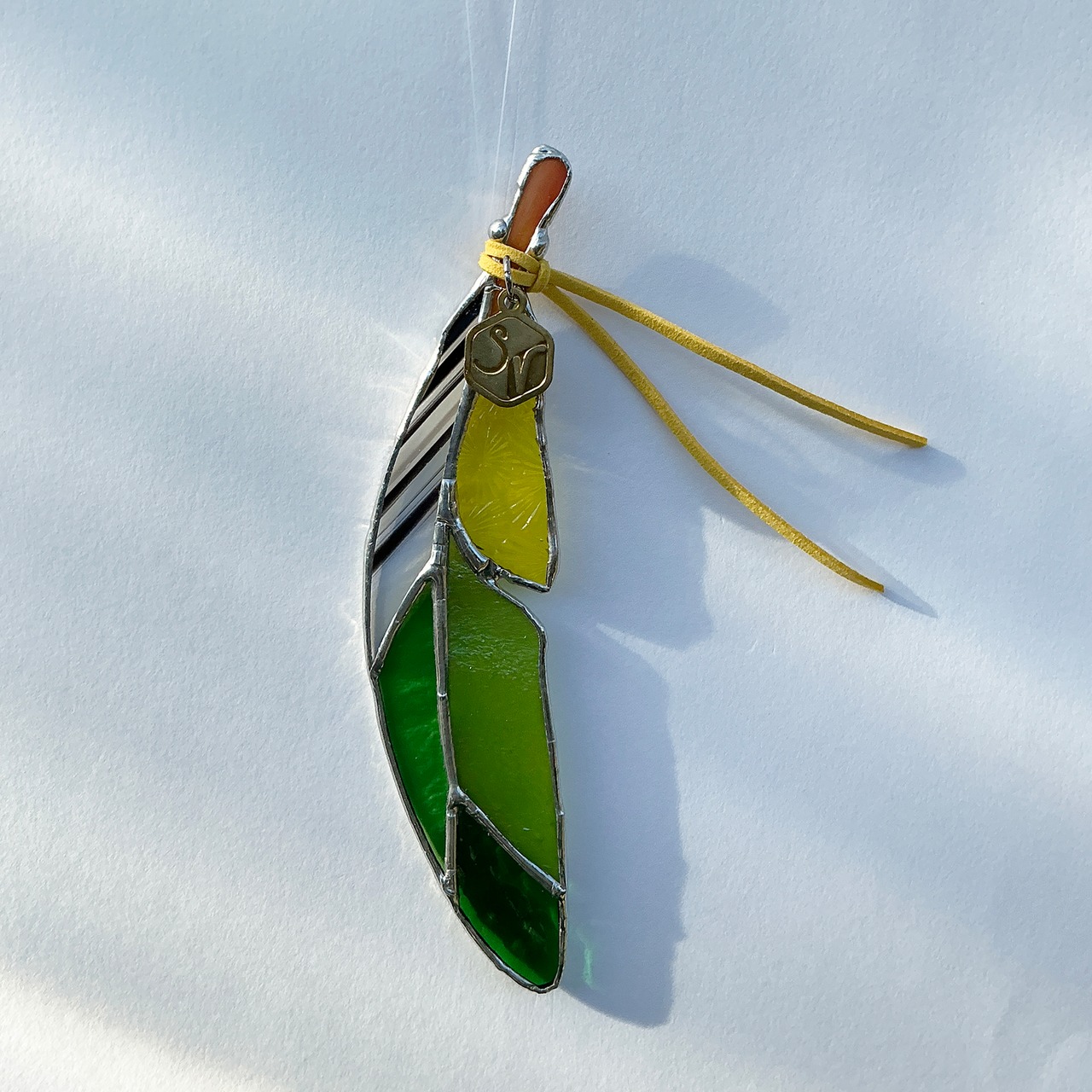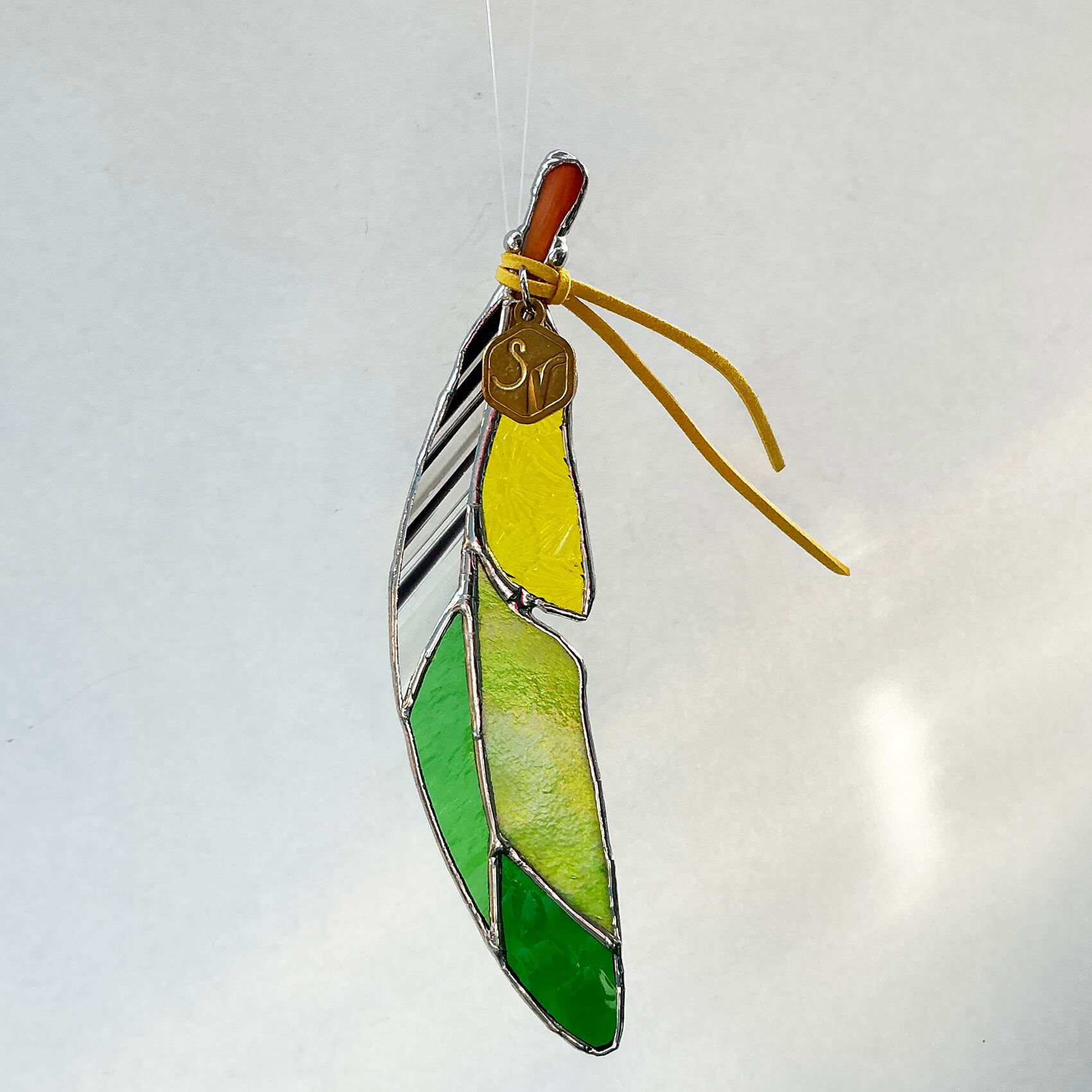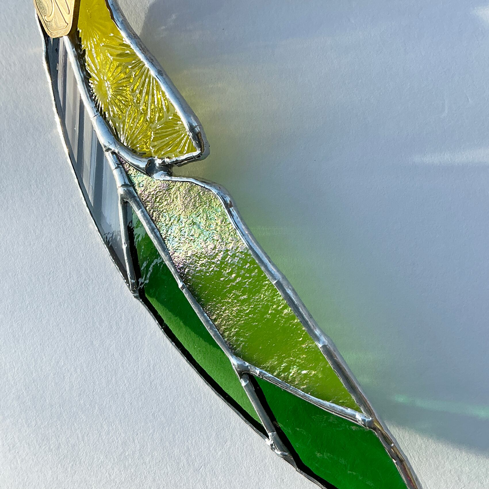 この『セキセイインコ/ノーマル・イエロー』のオーナメントは、まるでセキセイインコが羽ばたき空を舞う瞬間を捉えたかのようなステンドグラス作品です。ノーマル・イエローの優しい色合いが、羽根の形に見事に表現されています。光を通すたびに、ガラスが鮮やかな色彩を放ち、部屋全体を暖かな雰囲気で包み込みます。☀️