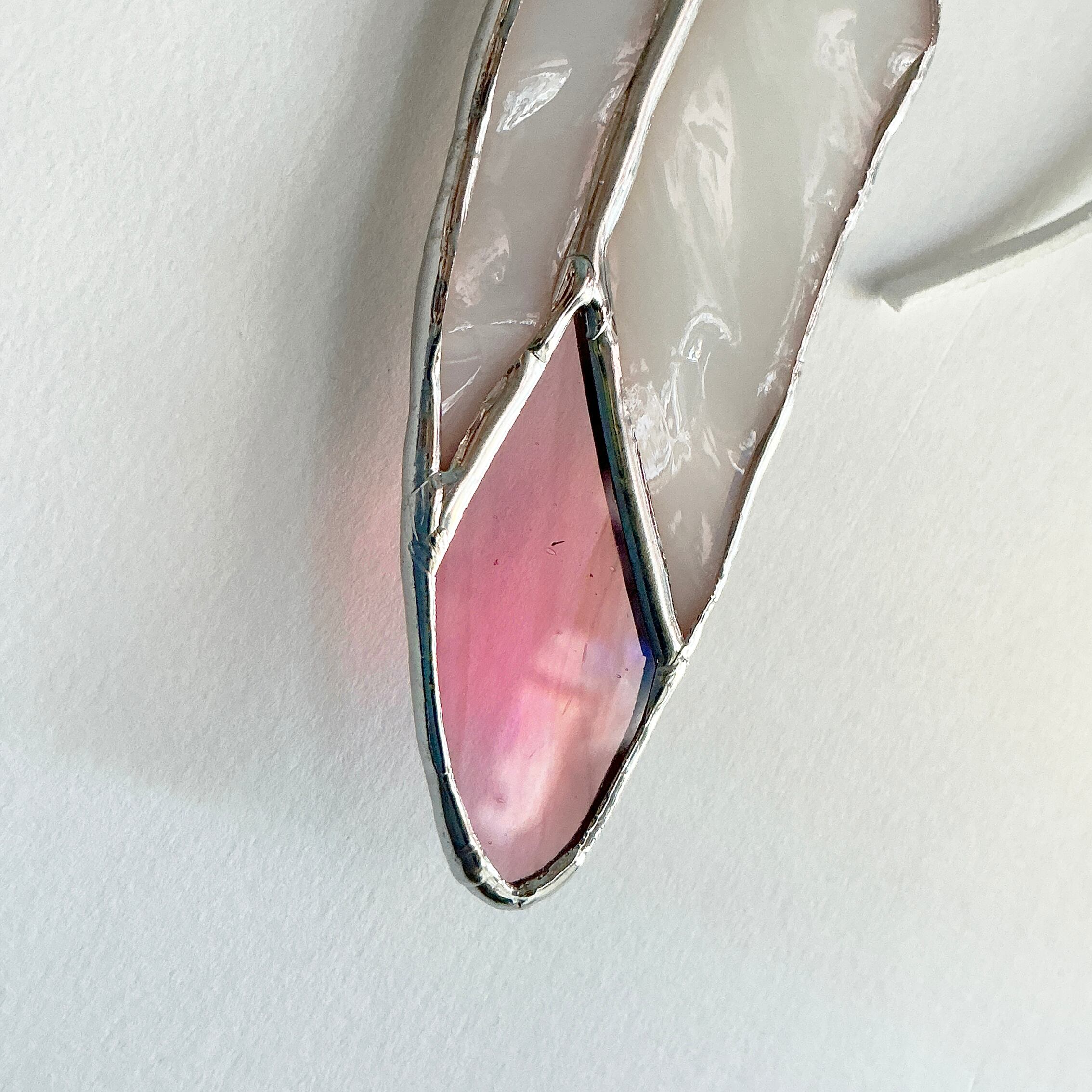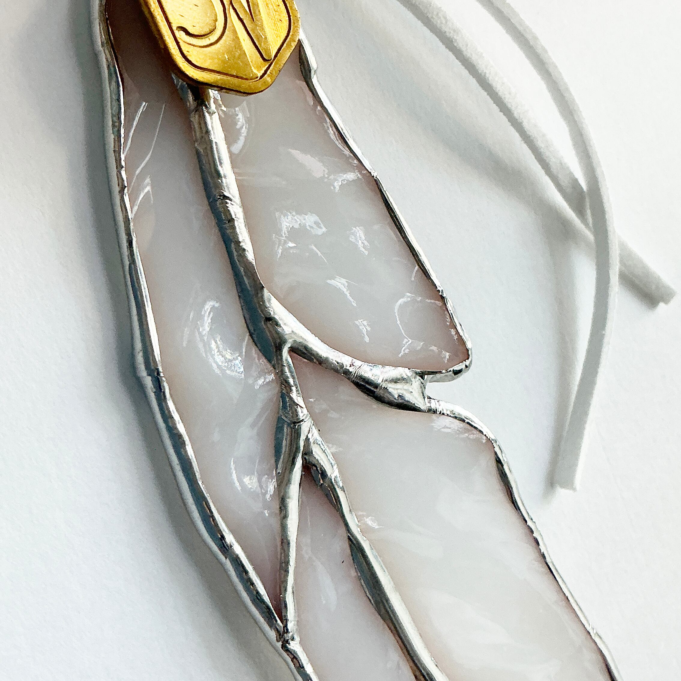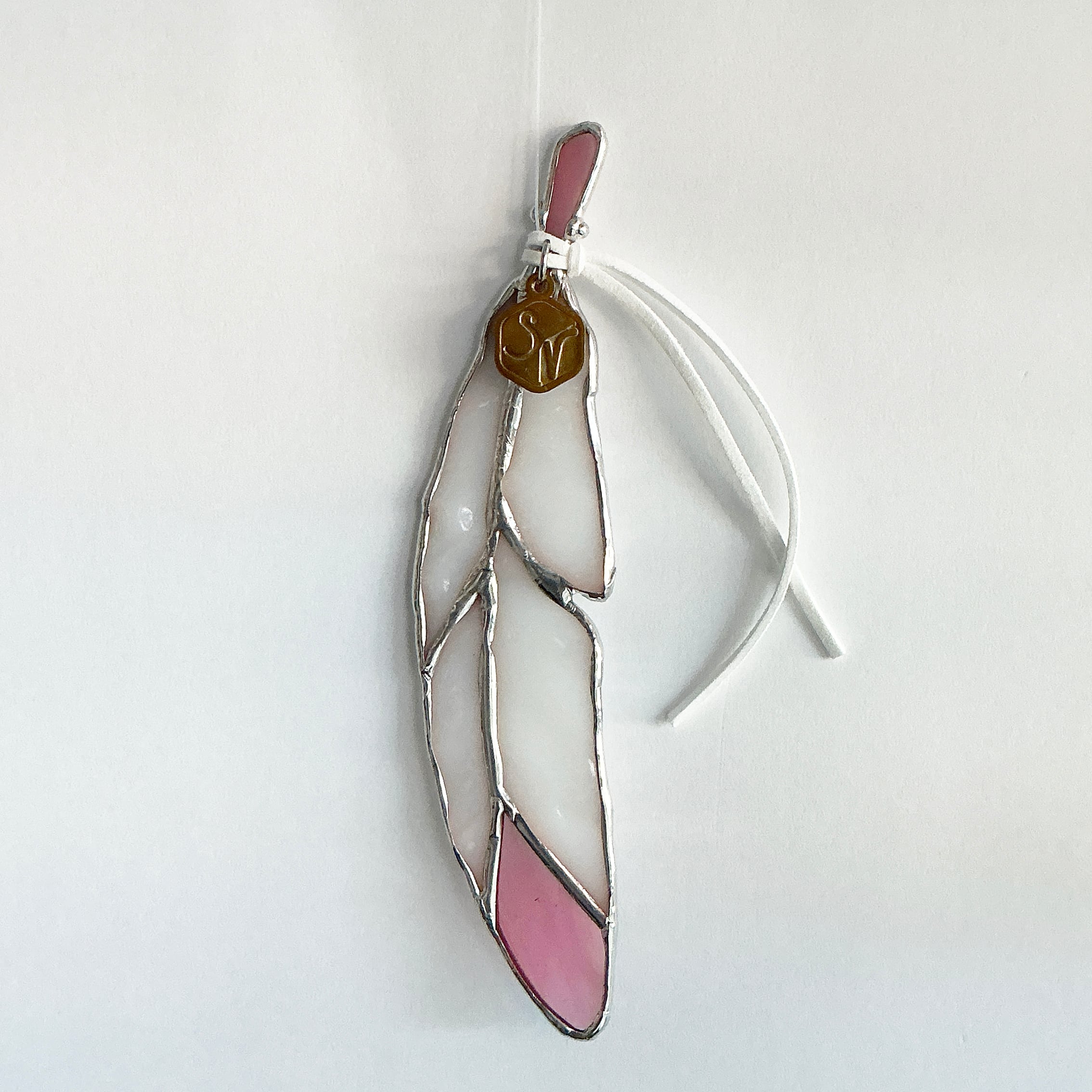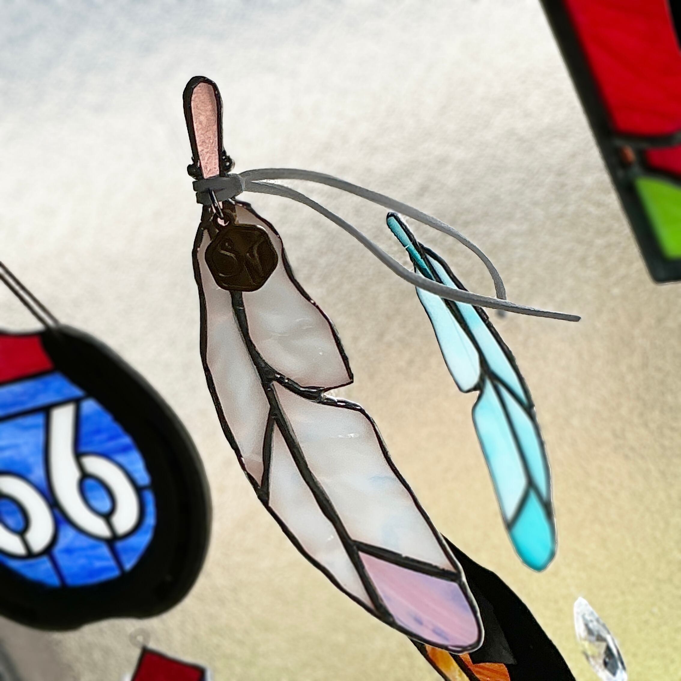 優雅に揺れる白文鳥カラーの羽根オーナメントは、あなたの空間に穏やかな癒しをもたらします。純白の羽根を模したステンドグラスが、まるで白文鳥の優雅な飛翔を思わせるように光を受けて輝きます。柔らかい光を通したガラスの質感は、鳥の羽根のように繊細でありながら、風に揺れるたびに心を和ませる存在感を放ちます。