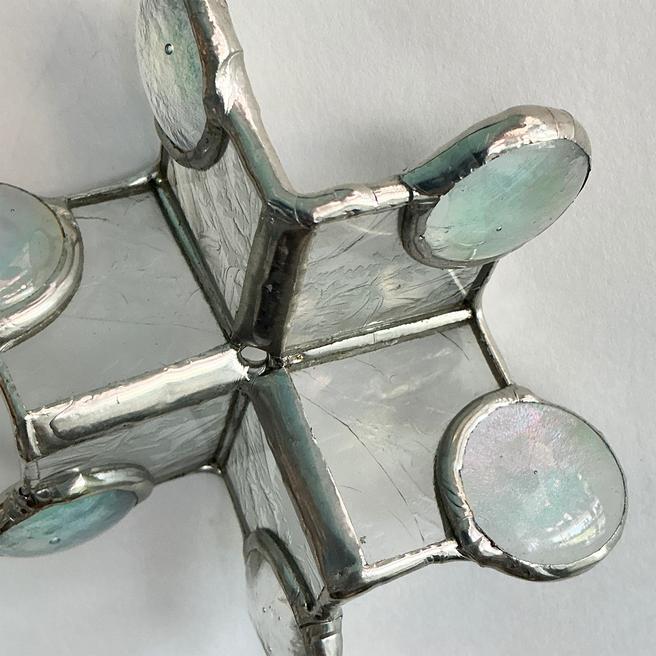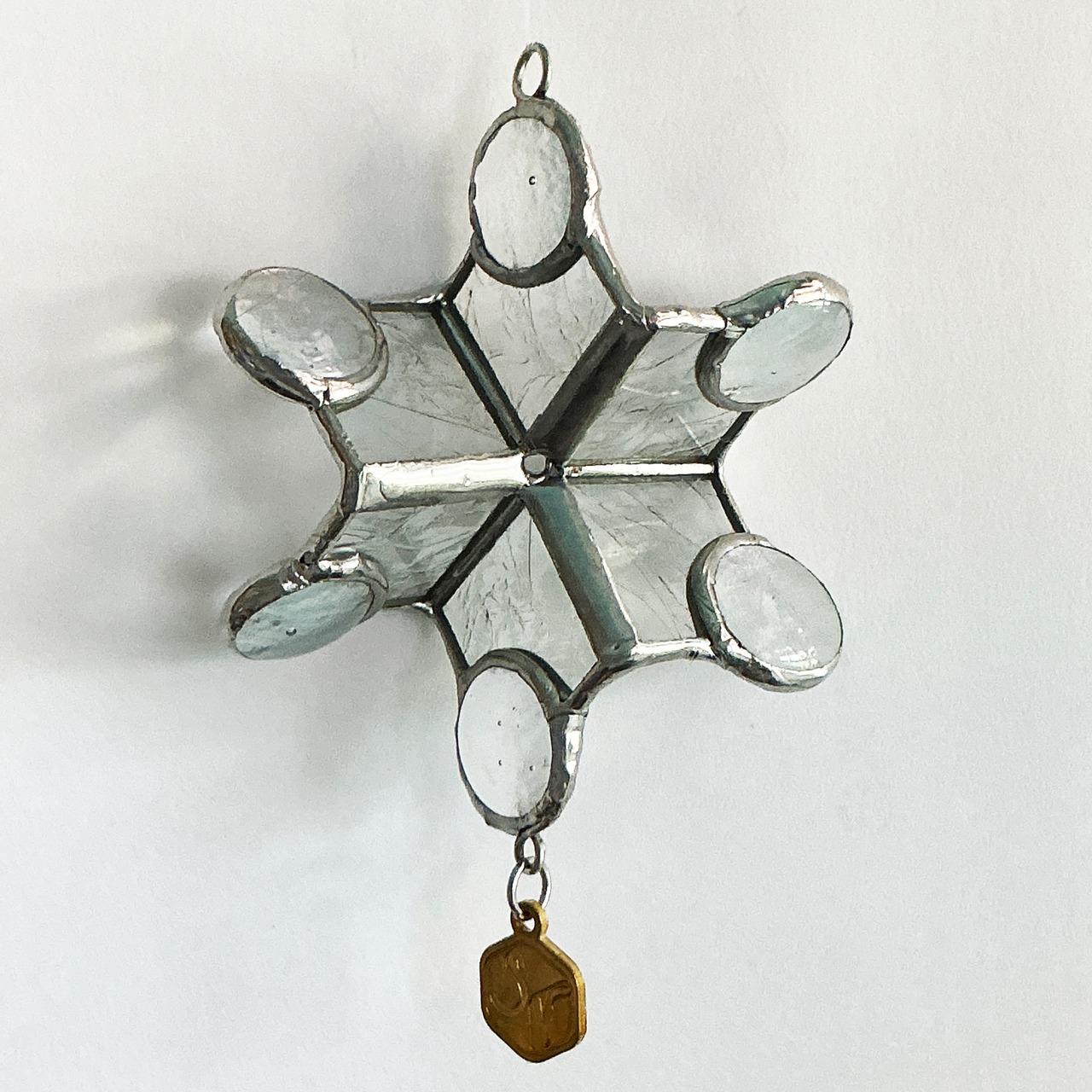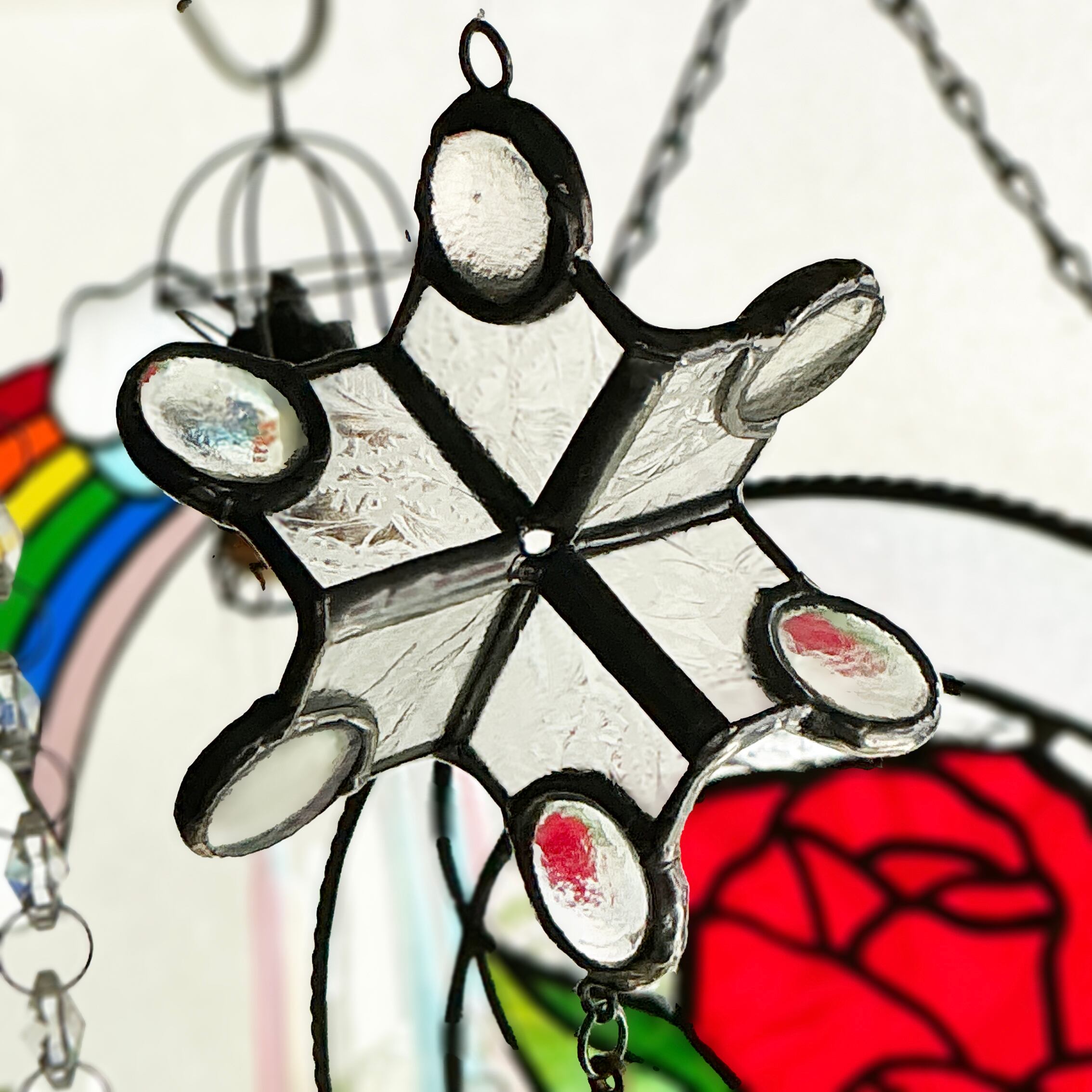 冬の魔法をインテリアに—『静寂の結晶サンキャッチャー』は、まるで雪の結晶が窓辺に舞い降りたかのような美しさを持つステンドグラスの逸品です。