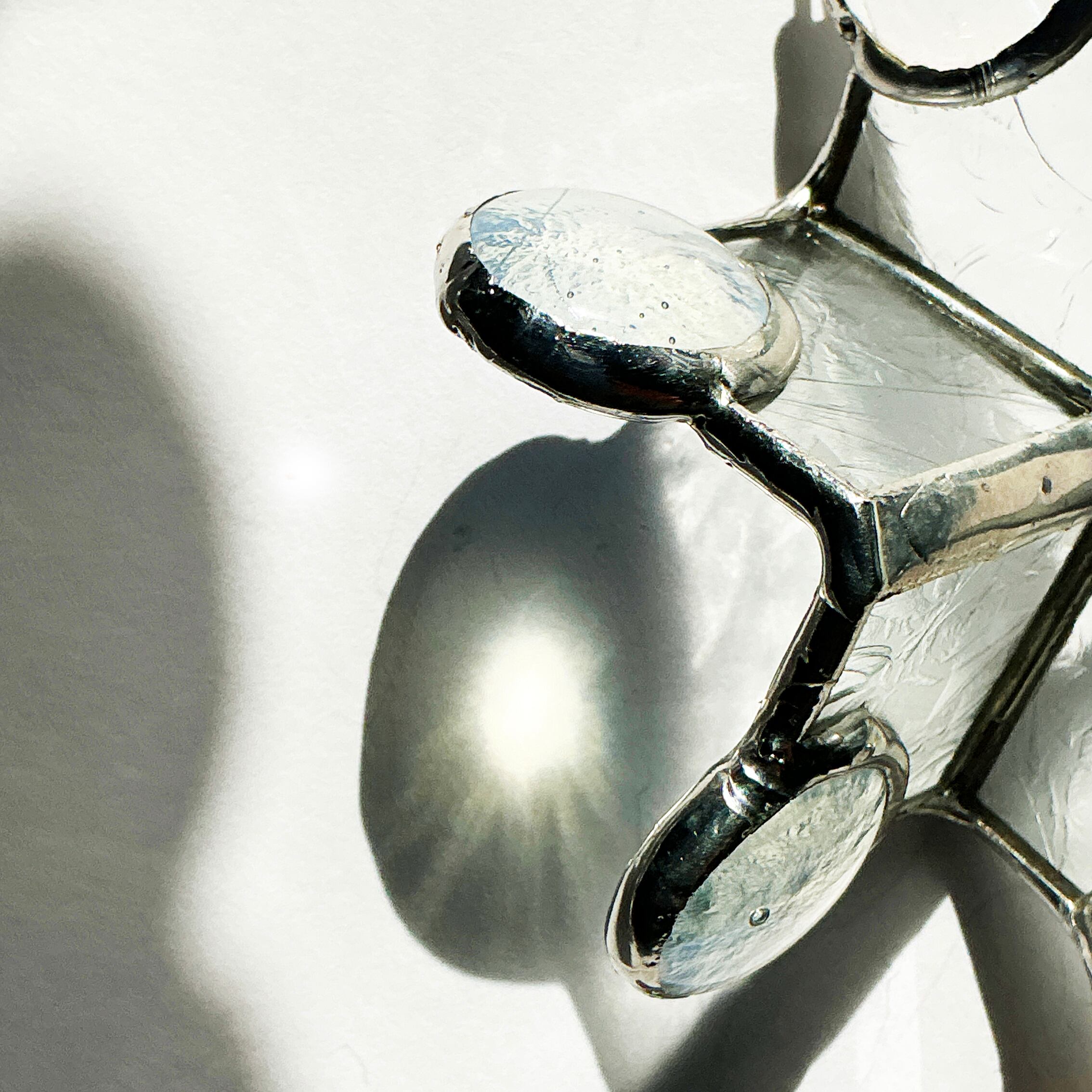 透明感ある薄氷を思わせるガラスに、淡い虹色を閉じ込めたナギットを6つの角に配置し、光を優雅に集めて幻想的な輝きを放ちます。