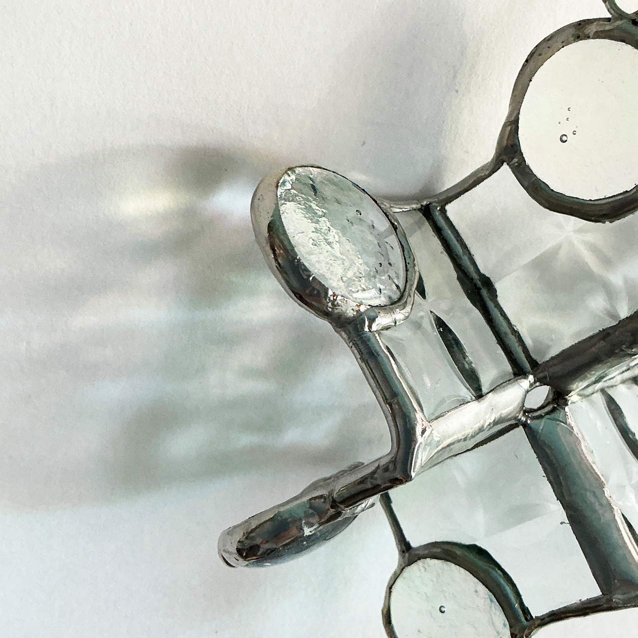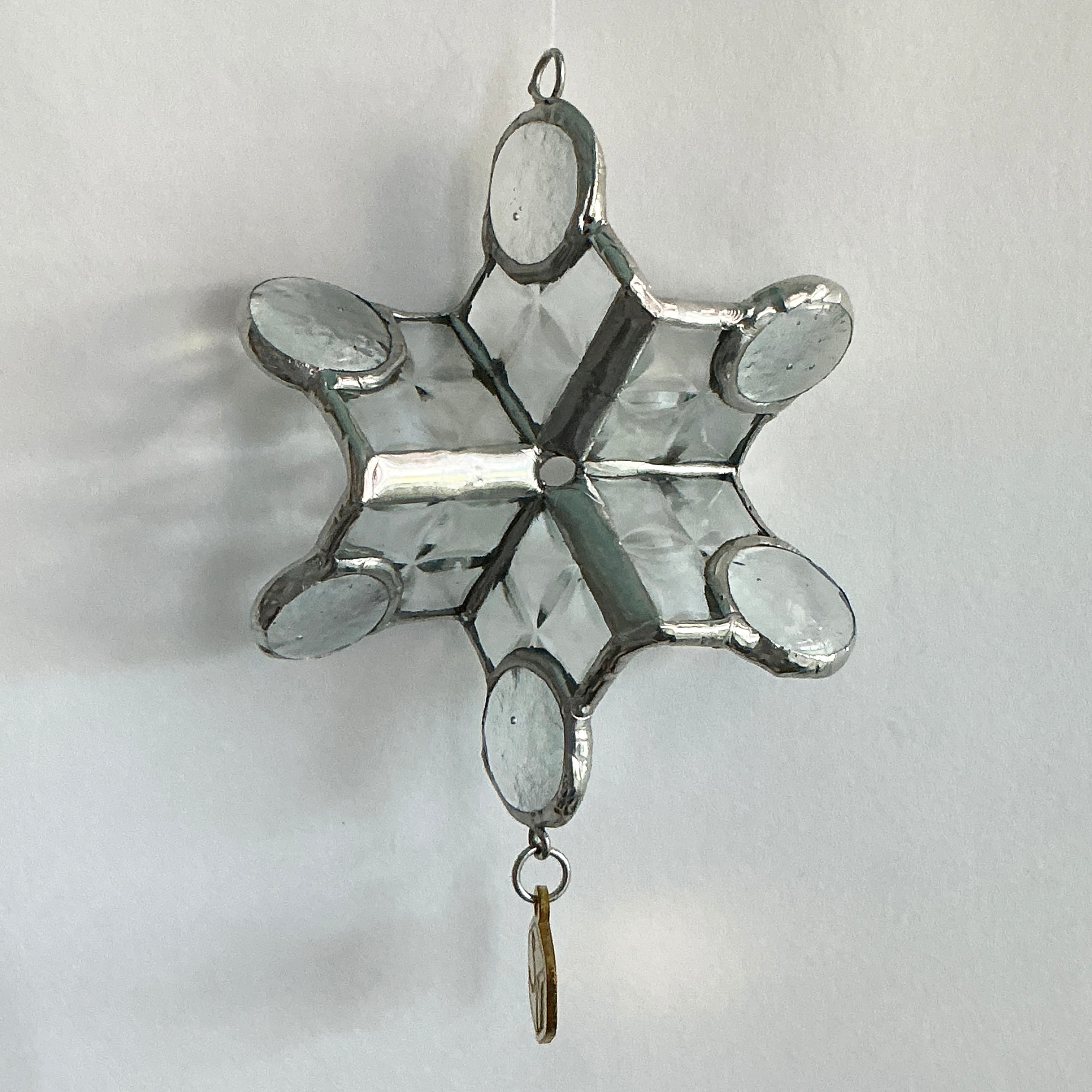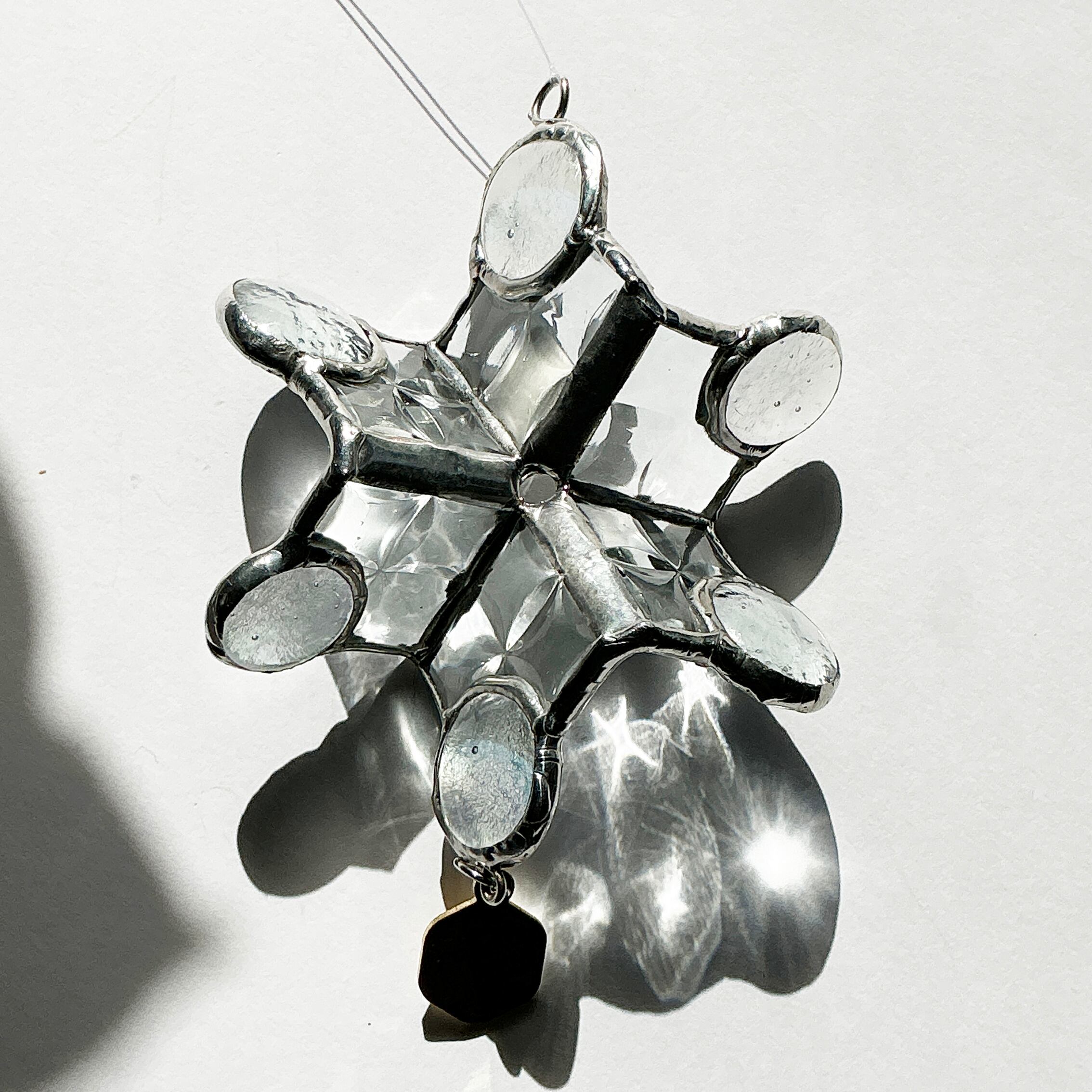 冬の魔法をお届けする『静寂の結晶サンキャッチャー』は、雪の結晶をモチーフに、氷のようなカットガラスが贅沢に輝く作品です。六片の先端に配置された淡い虹色のナギットが光を集め、まるで冬の静寂の中に見え隠れする虹のような幻想的な影を作り出します。