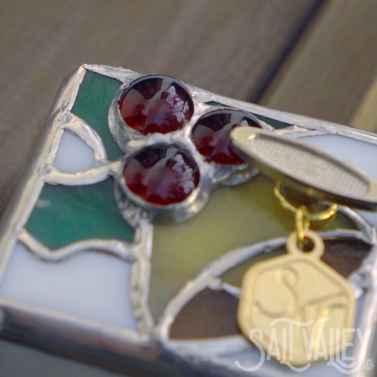 ベルをメインモチーフに、ヒイラギを配することによってよりクリスマス気分を盛り上げてくれるデザインにしました。柊の実にはナギット可愛く並べ、色が綺麗に見られるよう工夫しています。背景となる部分はホワイトクリスマスのイメージで白いガラスをチョイスしました。