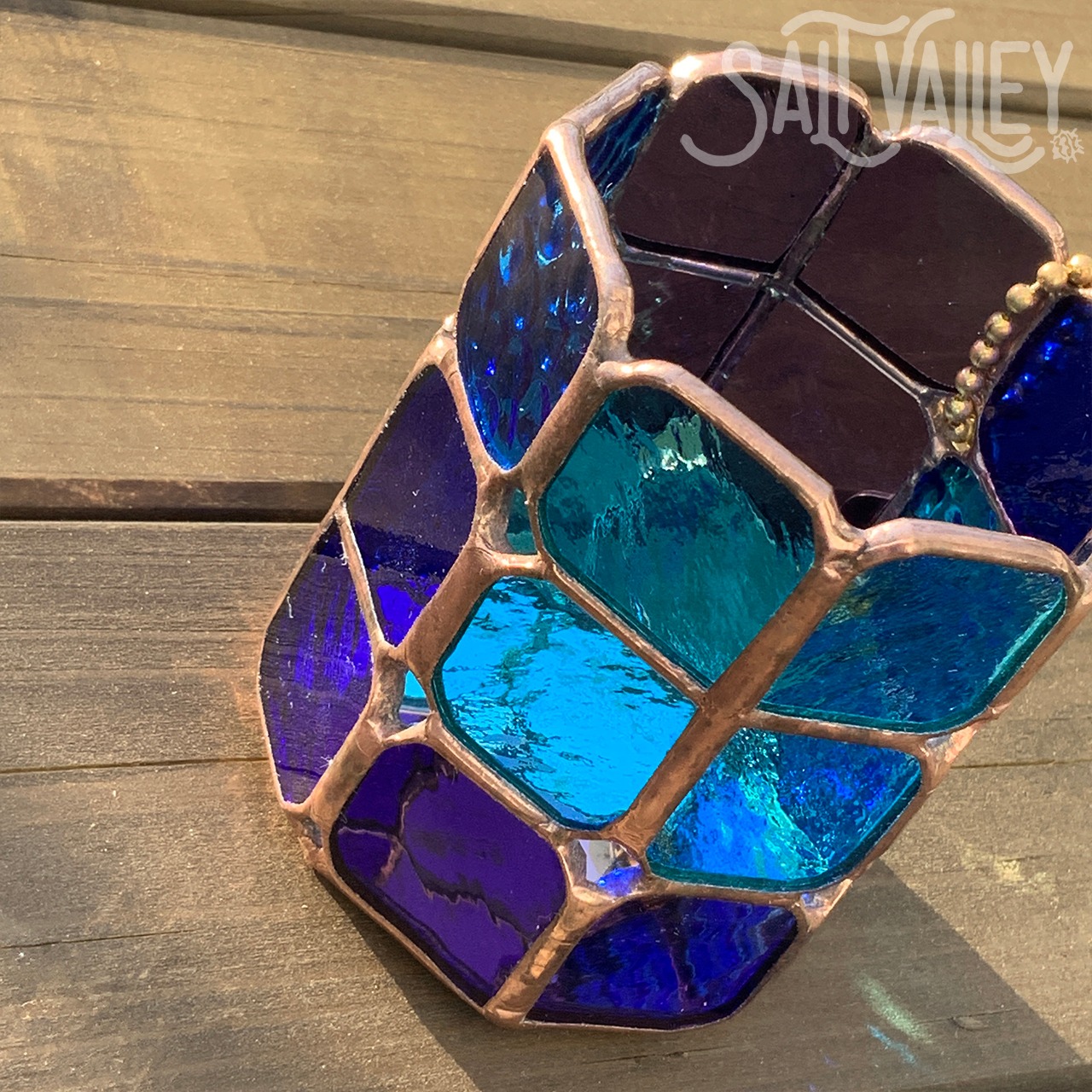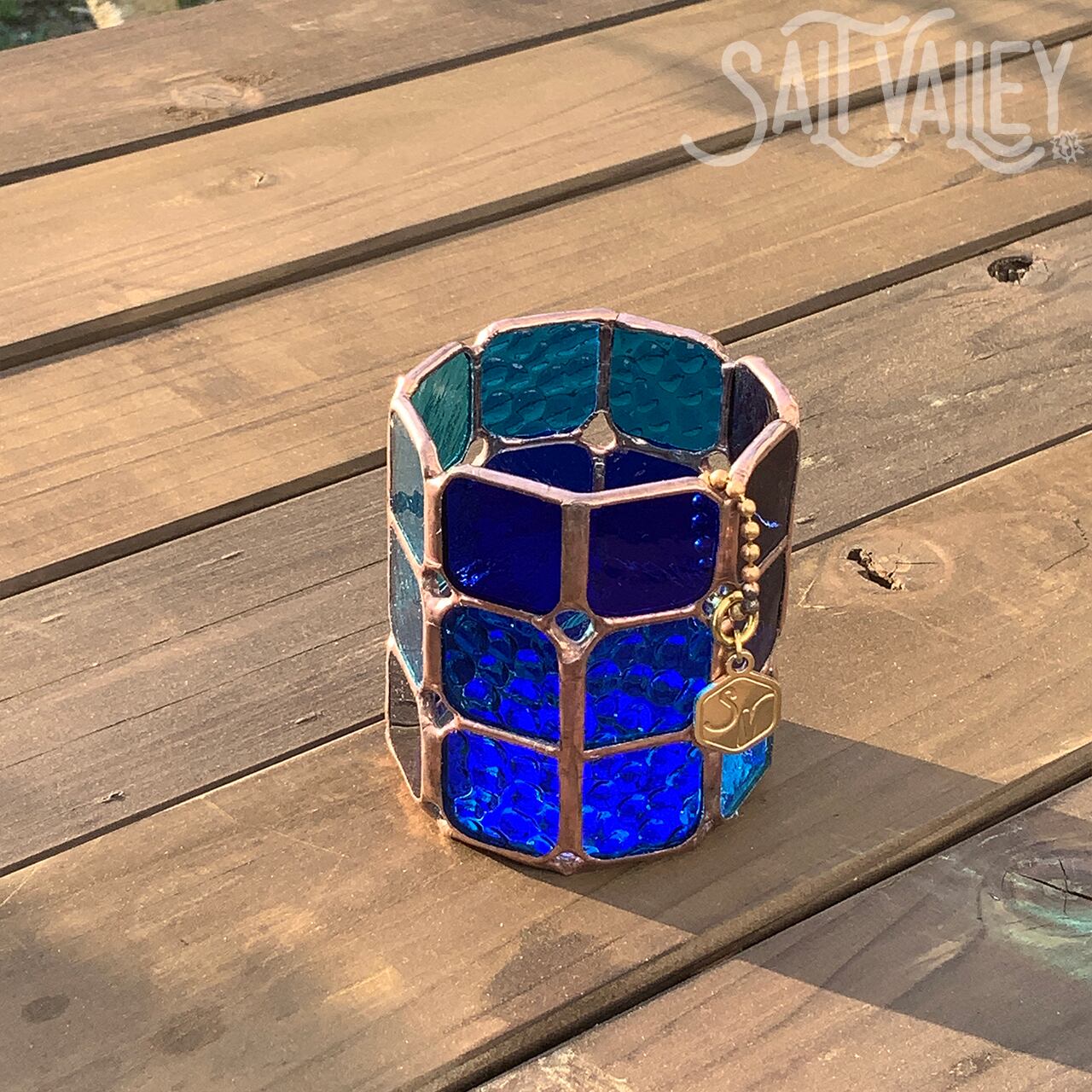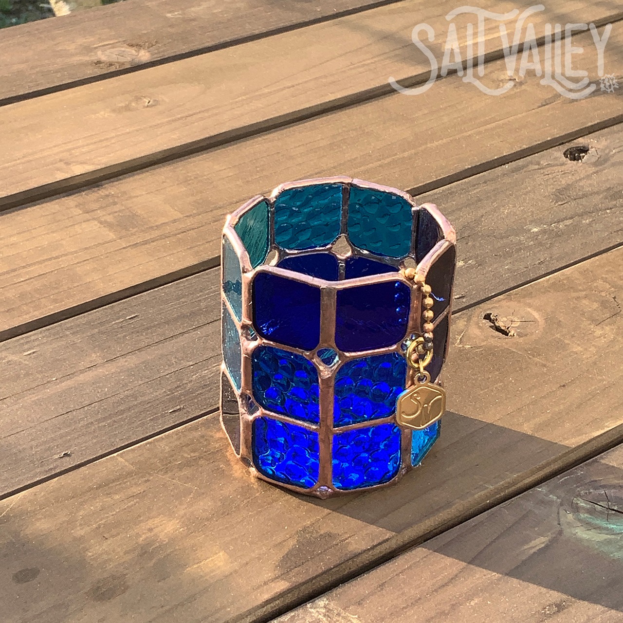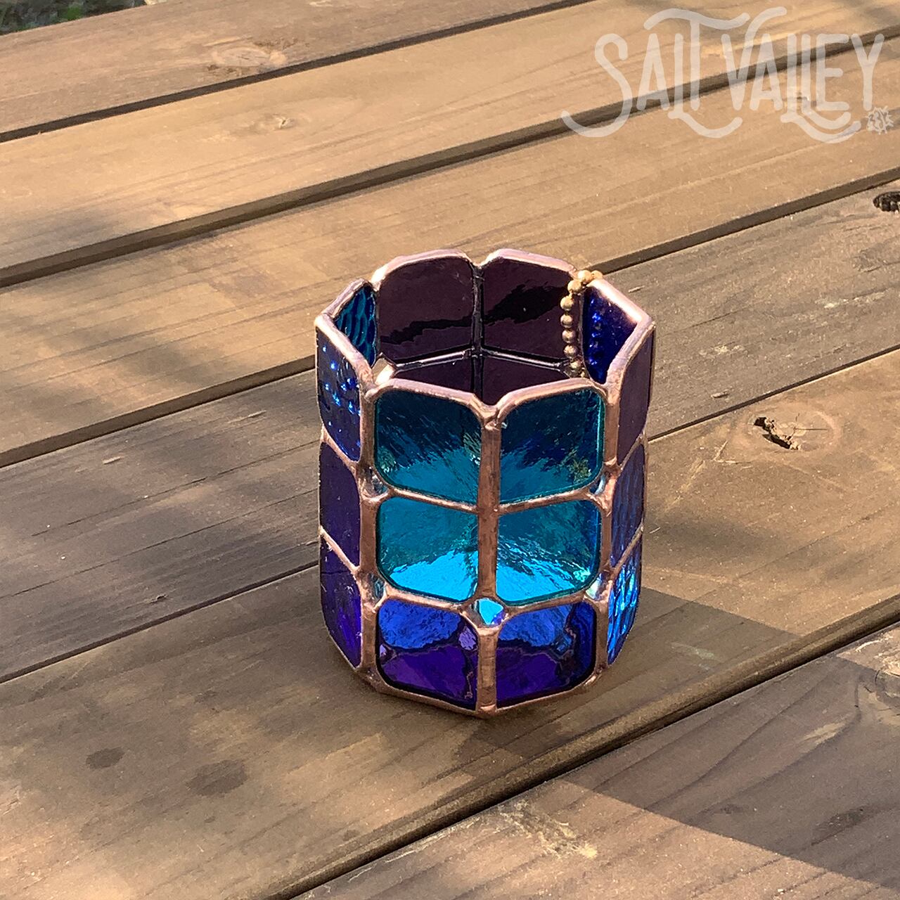 ブルーをメインに少し紫寄りのガラスを合わせて、見る角度によってさまざまな表情を楽しめます。