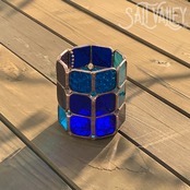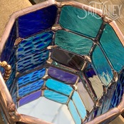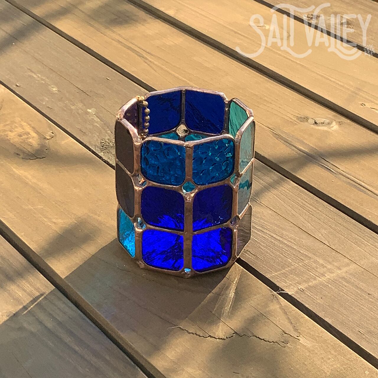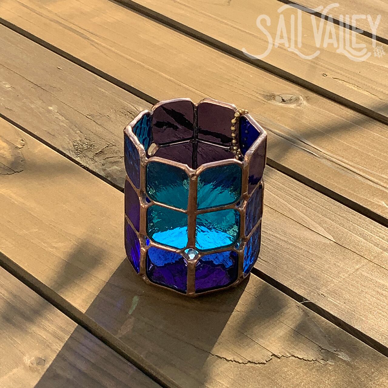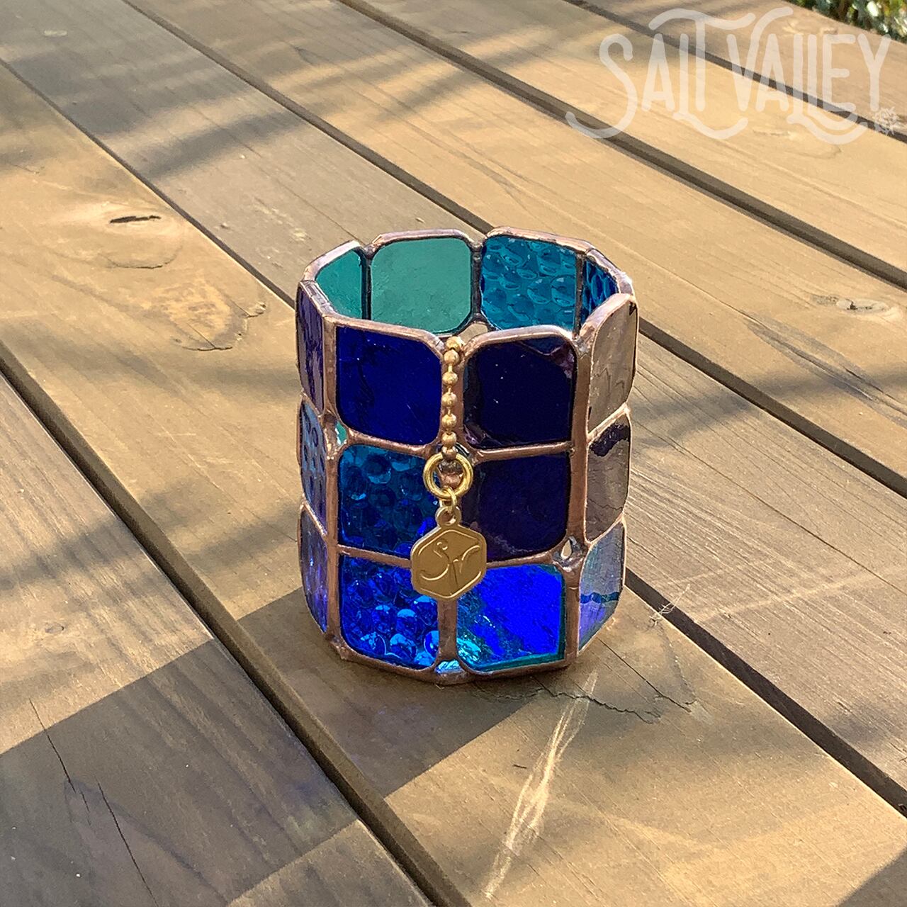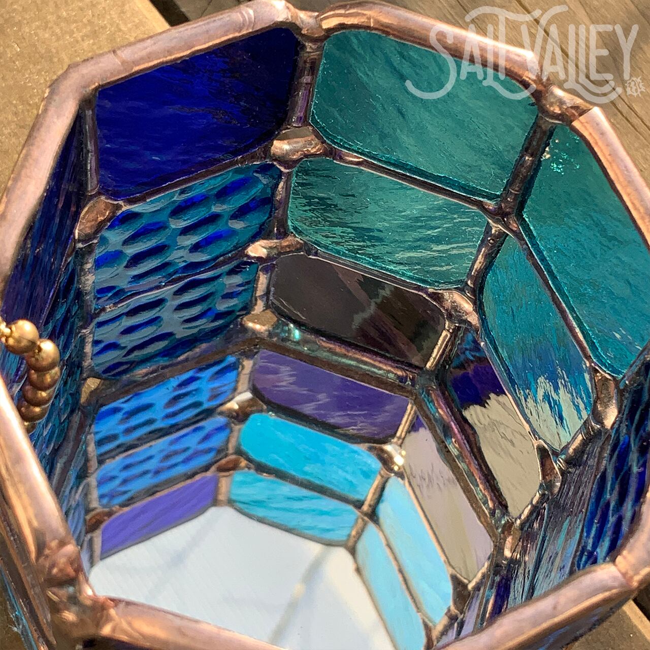 ブルーをメインに少し紫寄りのガラスを合わせて、見る角度によってさまざまな表情を楽しめます。