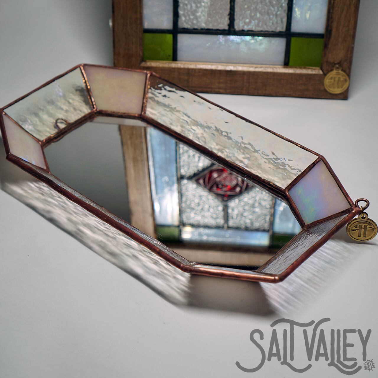 仕切り板付の、底にミラーを使った長めの八角形のトレー、出来ました。